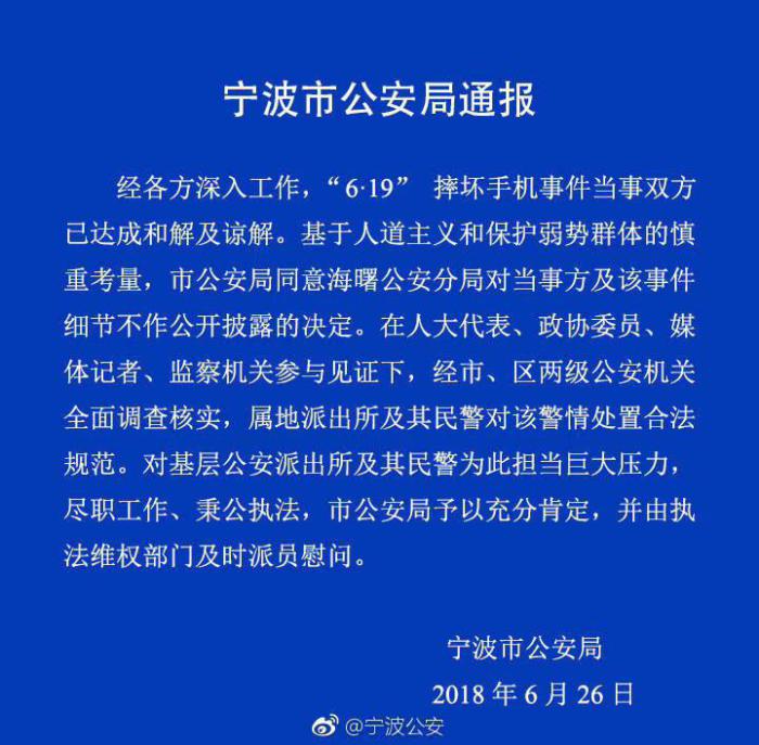 今天,寧波市公安局通過新浪官方微博回應(yīng)網(wǎng)友關(guān)注。警方稱:“6·19”摔壞手機事件當(dāng)事雙方已達成和解及諒解,出于人道主義,警方對當(dāng)事方及該事件細節(jié)不做公開披露。