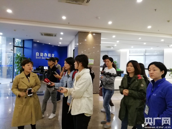 記者們在園區(qū)內(nèi)的政務(wù)大廳采訪(央廣網(wǎng)發(fā) 海南臺陳海波 攝)