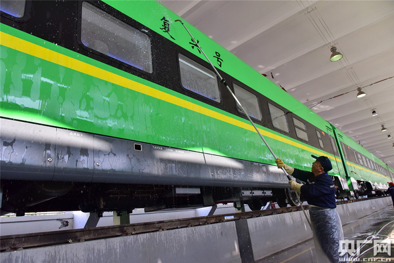 1月8日,重慶北運(yùn)用車間保潔人員正在清洗“綠巨人”外皮(央廣網(wǎng)發(fā) 通訊員陳亞 攝)
