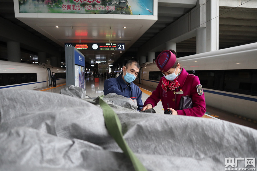 央廣網(wǎng)重慶2月8日消息(記者趙聰聰 通訊員鐘潔)2月7日10:21分,從重慶西站開往昆明南站的G2875次裝載68件高鐵快件正點(diǎn)開出。開車前,值乘該趟列車的重慶客運(yùn)段列車長楊泰佳與中鐵快運(yùn)、重慶西站工作人員認(rèn)真核對(duì)信息,辦理交接,做好高鐵快運(yùn)運(yùn)輸組織工作。據(jù)悉,近期受到疫情影響,高鐵快件在節(jié)后出現(xiàn)明顯增長,僅G2875次列車較上周增長3倍左右。