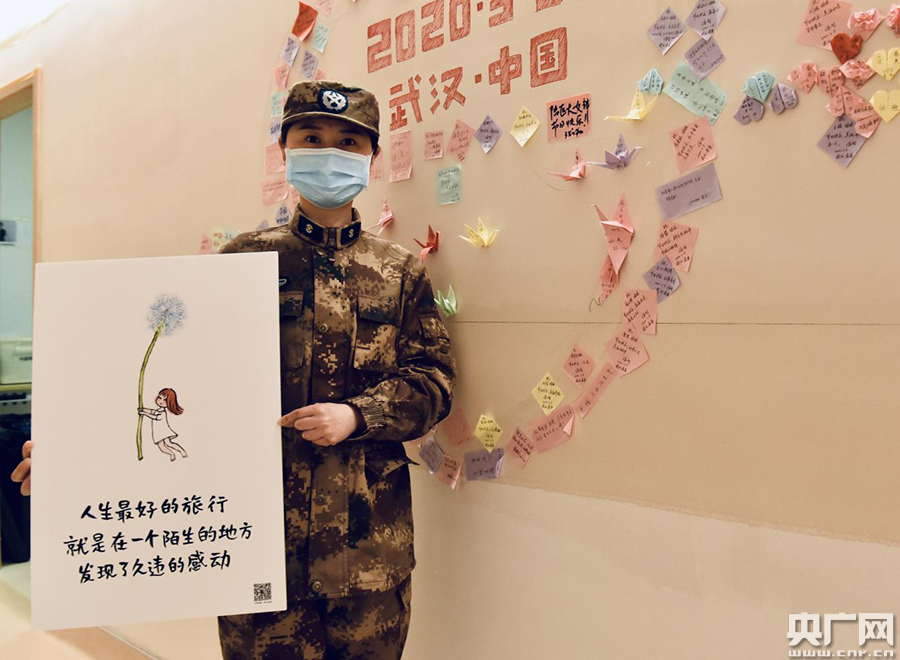 所以,曾欽婭專(zhuān)門(mén)挑了一幅寫(xiě)有:人生最好的旅行就是在陌生的地方發(fā)現(xiàn)了久違的感動(dòng)。她說(shuō):“武漢人民的平安及笑臉,也是支持我們繼續(xù)前行的動(dòng)力!”