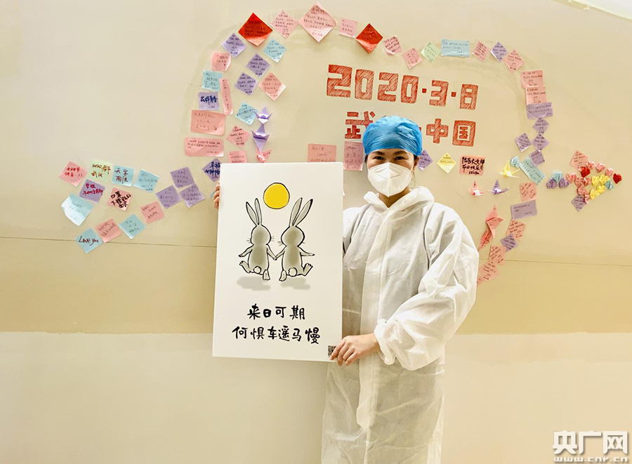 唐棠副護(hù)士長(zhǎng)捧著一張寫(xiě)有“來(lái)日可期,何懼車(chē)遙馬慢”的漫畫(huà)說(shuō)到:“勝利就在眼前,我們一定要不麻痹、不厭戰(zhàn)、不松勁,慎終如始,全力救治患者!”