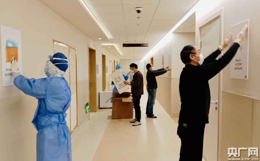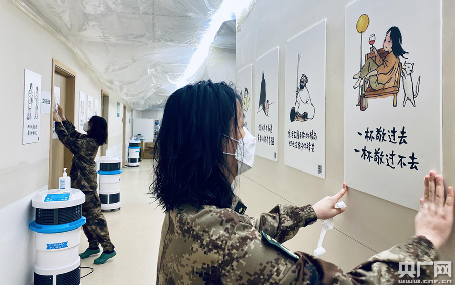 醫(yī)護(hù)人員與患者在隔離病區(qū)精心布置漫畫(huà)(央廣網(wǎng)發(fā) 通訊員曾理 攝)