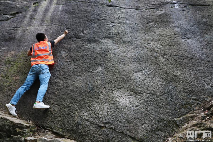地質(zhì)遺跡保護(hù)研究院研究人員現(xiàn)場描繪恐龍足跡(央廣網(wǎng)發(fā) 重慶市規(guī)劃和自然資源局供圖)