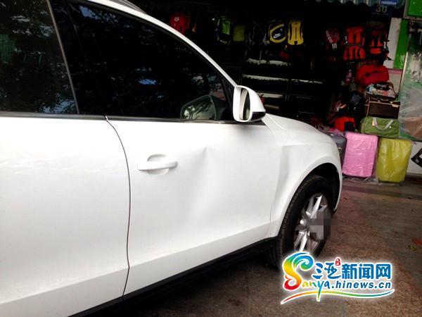 沖突中,停在一邊的轎車(chē)被撞凹陷(三亞新聞網(wǎng)記者 劉麗萍攝)