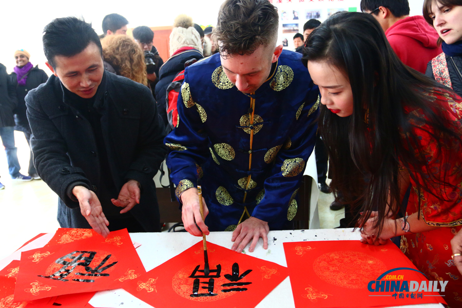 “春鬧三羊開景泰,花紅四海浴天香!睔g樂春節(jié)活動現(xiàn)場,冰島女士Arna潑墨揮毫,寫下了這幅春聯(lián),表達(dá)了外籍人士對中國羊年的美好祝福。