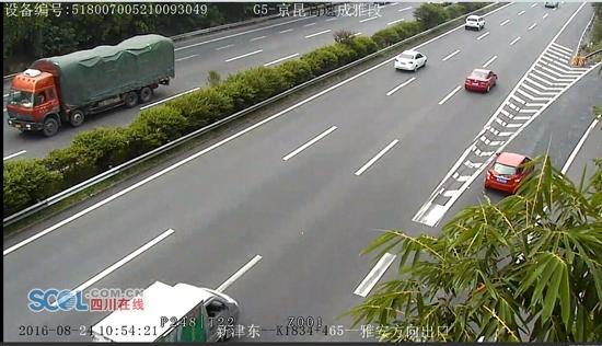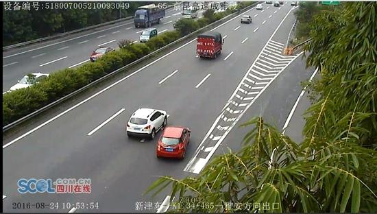 記者從高速交警提供的視頻看見,當(dāng)天10時(shí)53分許,一輛紅色的小車快要開過成雅高速新津東出口時(shí),突然從右側(cè)第二車道變道到第三車道,準(zhǔn)備碾壓導(dǎo)流線開出出口。不過,駕駛員在原地停了兩秒鐘,這時(shí),更大膽的一幕出現(xiàn)了,紅色小車開始慢吞吞的在高速路上“蛇形”倒車。只見這輛車左一盤子、右一盤子,在第三條車道和第二條車道之間拐來拐去向后倒車,花了32秒的時(shí)間在高速公路上倒車了20米的距離,這期間,不停有大貨車、小車按著喇叭從紅色小車的左邊、右邊快速開過,場面非常緊張。