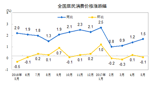 。ㄔ瓨(biāo)題:2017年5月份居民消費價格同比上漲1.5%)