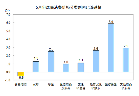 5月份,其他七大類價格同比均有所上漲。其中,醫(yī)療保健價格上漲5.9%,其他用品和服務(wù)價格上漲2.9%,教育文化和娛樂價格上漲2.6%,居住價格上漲2.5%,衣著、交通和通信、生活用品及服務(wù)價格分別上漲1.3%、1.1%和1.0%。
