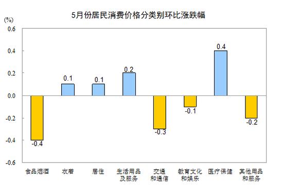 5月份,全國居民消費價格總水平環(huán)比下降0.1%。其中,城市下降0.1%,農(nóng)村下降0.1%;食品價格下降0.7%,非食品價格持平;消費品價格下降0.2%,服務(wù)價格上漲0.1%。