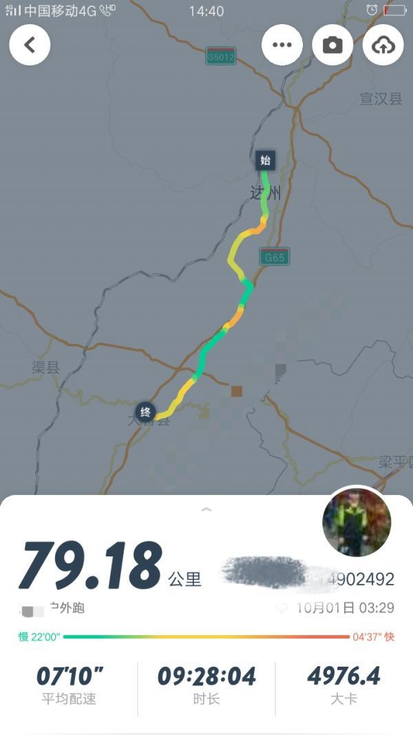 王浪:跑之前看地圖顯示73公里左右,預(yù)計(jì)步行需要17個(gè)小時(shí)多。但我用跑步軟件記錄的,從學(xué)校到大竹縣雙馬車(chē)站,跑了79.18公里,總計(jì)花了9個(gè)小時(shí)28分,包括了中途休息、補(bǔ)充能量所需的時(shí)間。