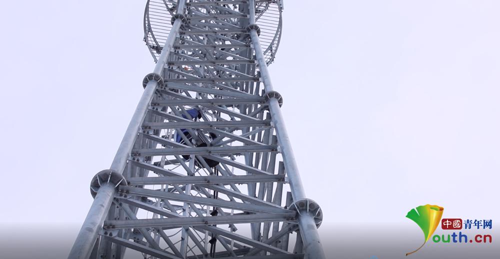 牡丹江電務(wù)段高鐵通信工們正在攀塔。視頻截圖