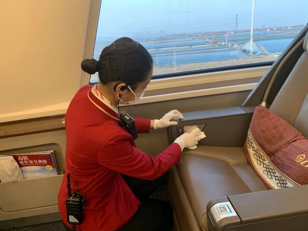孔維爽:高鐵列車出庫前,鐵路防疫部門對全車內進行常規(guī)消毒,庫內保潔人員負責對座椅扶手、小桌板、衛(wèi)生間馬桶、衛(wèi)生間門把手、衛(wèi)生間沖水按鈕、衛(wèi)生間門鎖銷、風擋隔離端門開關按鈕、商務車座椅調節(jié)按鈕等重點部位進行擦拭消毒。班組人員的日常健康狀況、家屬身體情況、行車安全、作業(yè)標準、服務質量、防疫物資使用等,我們進行全面監(jiān)督指導。