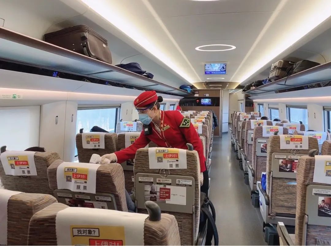 孔維爽:疫情期間,鐵路部門實行隔座分散售票,不發(fā)售無座票,并預留一定數(shù)量的隔離席位。我們車廂也是這樣安排的。目前,客流量不是很大,本次列車上座率在50%左右。