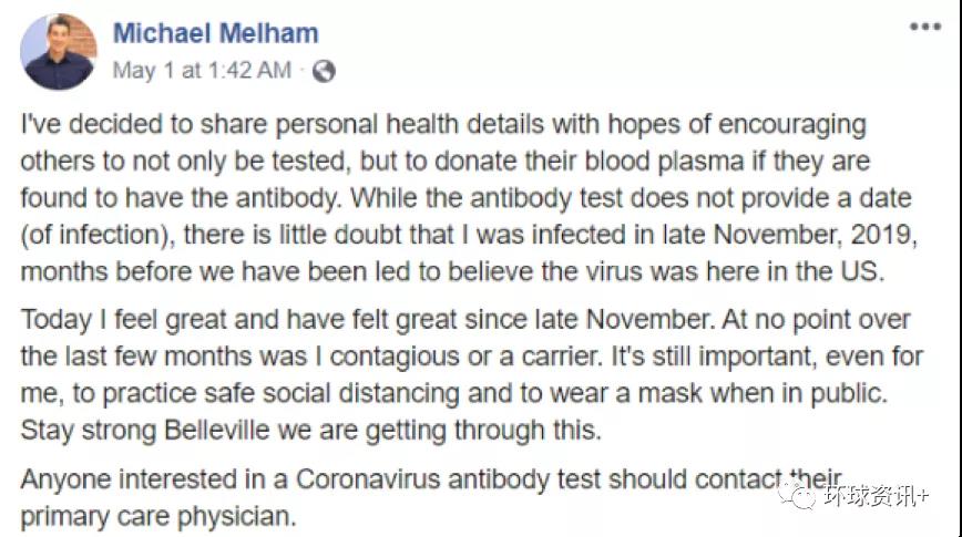 此前,美國(guó)新澤西州貝爾維爾市市長(zhǎng)邁克爾·梅爾哈姆5月1日在其社交媒體上發(fā)文稱,他認(rèn)為自己去年11月生病就是因?yàn)楦腥玖诵鹿诓《。他說,當(dāng)時(shí)醫(yī)生診斷他得了流感,可后來新冠病毒抗體檢測(cè)結(jié)果卻呈陽性。梅爾哈姆說,他身邊的很多人曾在去年11月、12月生病且癥狀嚴(yán)重。