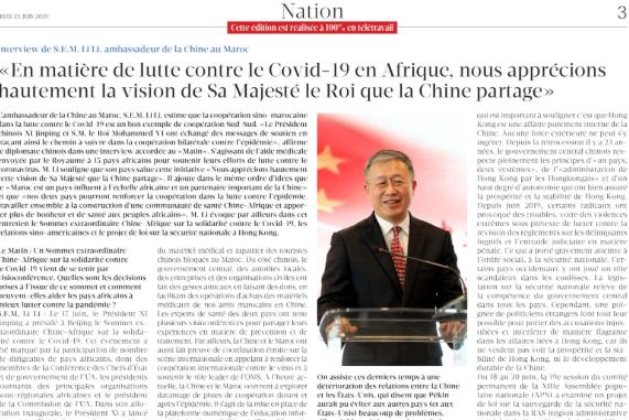 中國(guó)駐摩洛哥大使李立當(dāng)?shù)貢r(shí)間24日就中非團(tuán)結(jié)抗疫特別峰會(huì)、中摩抗疫合作、北京新發(fā)疫情、中美關(guān)系以及疫后經(jīng)濟(jì)形勢(shì)接受了摩洛哥發(fā)行量最大的法文報(bào)紙《晨報(bào)》專訪。李大使在采訪中表示,中非團(tuán)結(jié)抗疫特別峰會(huì)是在中非雙方抗擊新冠肺炎疫情的重要時(shí)刻召開(kāi)的一次重要會(huì)議,與會(huì)中非領(lǐng)導(dǎo)人就深入推進(jìn)中非抗疫合作達(dá)成重要共識(shí),充分體現(xiàn)了中非雙方?jīng)Q心深化中非友好,加強(qiáng)相互支持,著力構(gòu)建更加緊密的中非命運(yùn)共同體的決心。