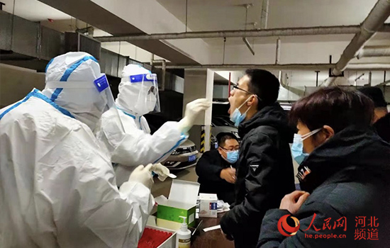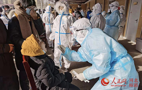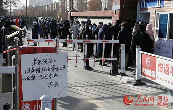 1月7日,石家莊鹿泉區(qū)安聯(lián)青年城小區(qū)居民進行核酸檢測。 人民網(wǎng)楊文娟攝