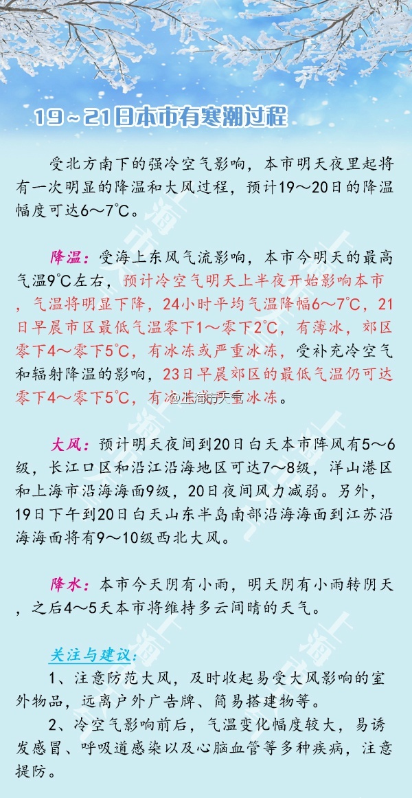 央廣網(wǎng)上海1月18日消息 據(jù)上海市氣象局官方微博@上海市天氣消息,受北方南下的強(qiáng)冷空氣影響,上海明天夜里起將有一次明顯的降溫和大風(fēng)過(guò)程,預(yù)計(jì)19~20日的降溫幅度可達(dá)6~7℃,21日早晨市區(qū)最低氣溫零下1~零下2℃,有薄冰,郊區(qū)零下4~零下5℃,有冰凍或嚴(yán)重冰凍, 23日早晨郊區(qū)的最低氣溫仍可達(dá)零下4~零下5℃。