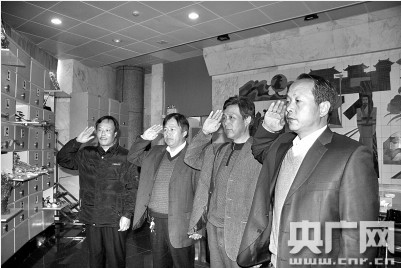 姚惠濤(右1)和同鄉(xiāng)的戰(zhàn)友在上海龍華烈士陵園內(nèi)祭奠陳建中 央廣網(wǎng)發(fā) 崇明宣傳部提供