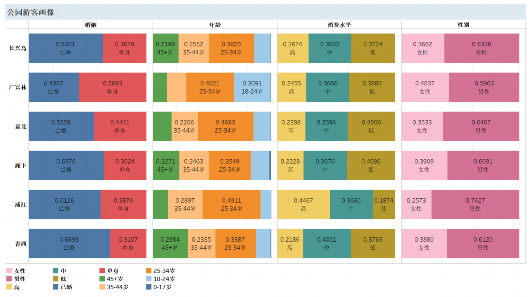 從6座郊野公園來看,已婚游客占比在60%以上。只有廣富林郊野公園,由于緊鄰松江大學城,單身游客占比超過了50%。在年齡上,25歲至34歲的年輕游客成為“中堅力量”。從性別上看,男性游客占比均超過60%,其中浦江郊野公園的男性游客占比接近75%。