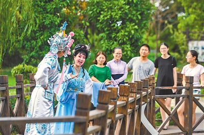 浙江桐鄉(xiāng)市屠甸鎮(zhèn)榮星村村民在村里的公園內(nèi)觀看越劇表演,這是該村“文化納涼”晚會的節(jié)目之一。資料圖片