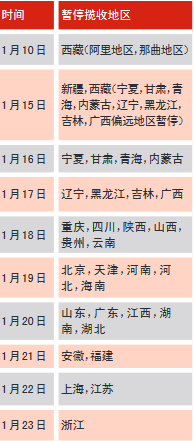 “目前,發(fā)往西藏、新疆的快件已經(jīng)暫停攬收!弊蛱,溫州中通、圓通等多家快遞公司如此表示。據(jù)了解,各家快遞公司已經(jīng)進(jìn)入“春節(jié)模式” ,一些偏遠(yuǎn)地區(qū)的快件已經(jīng)停止收件。而從1月16日開始,更多地區(qū)將暫停攬件;不過,浙江地區(qū)的快件收發(fā)每年都是“堅(jiān)持到最后”的,今年預(yù)計(jì)在1月22-24日停止。