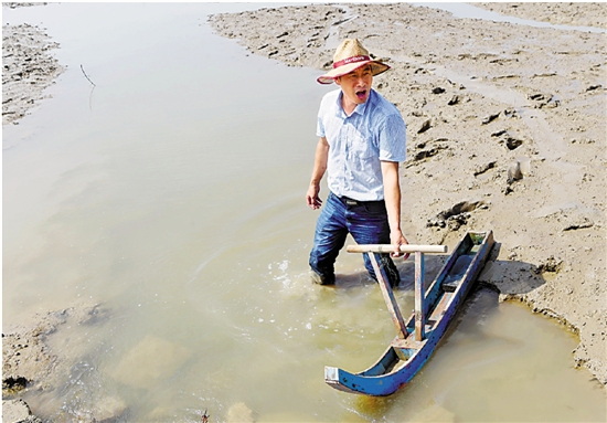 8月4日上午,象山縣塔頭旺村專職灘長(zhǎng)黃吉備腳蹬自己制作的“海馬”,在烈日下飛馳于茫茫灘涂!昂qR”是象山漁民在灘涂上行動(dòng)的主要交通工具,駕駛時(shí),一只腳跪在木制的“海馬”內(nèi),另一只腳蹬泥涂,就可以快速前行。“我每天要用‘海馬’在全村3000多畝灘涂上來回巡查一遍,看看有沒有串網(wǎng)和地籠網(wǎng),一旦發(fā)現(xiàn)及時(shí)報(bào)告給相關(guān)部門!秉S吉備說,前幾年灘涂上到處都是串網(wǎng)和地籠網(wǎng),這兩種網(wǎng)具以捕撈幼魚和小型魚類為主,破壞了漁業(yè)資源的養(yǎng)護(hù)與恢復(fù),也對(duì)灘涂區(qū)域的環(huán)境造成了破壞。