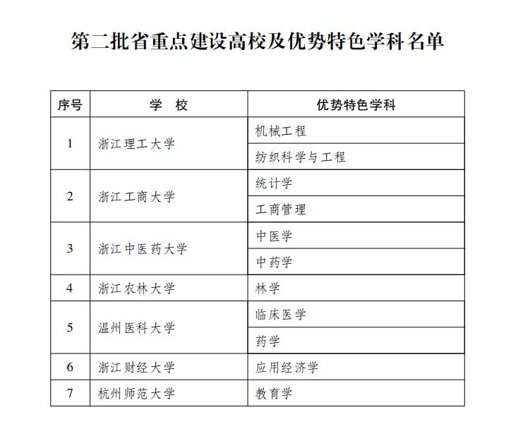 8月29日,記者從省政府官網(wǎng)獲悉,省政府決定啟動(dòng)第二批省重點(diǎn)高校建設(shè),同意省教育廳推選的浙江理工大學(xué)、浙江工商大學(xué)、浙江中醫(yī)藥大學(xué)、浙江農(nóng)林大學(xué)、溫州醫(yī)科大學(xué)、浙江財(cái)經(jīng)大學(xué)、杭州師范大學(xué)為第二批省重點(diǎn)建設(shè)高校。第二批省重點(diǎn)建設(shè)高校以優(yōu)勢(shì)特色學(xué)科為遴選依據(jù)和建設(shè)基礎(chǔ),共涉及11個(gè)學(xué)科。
